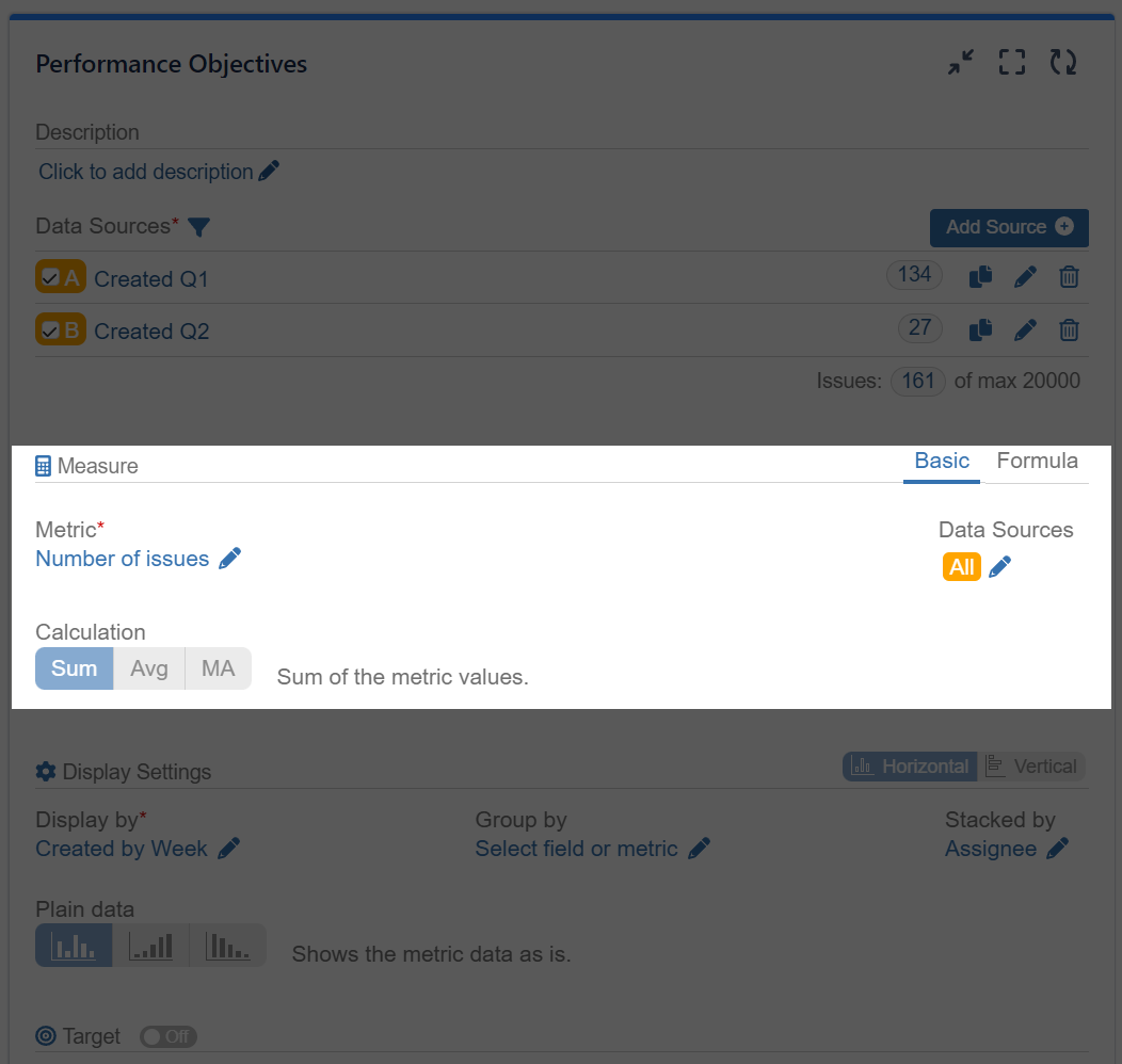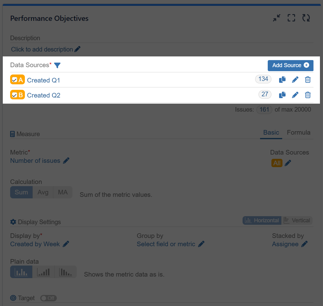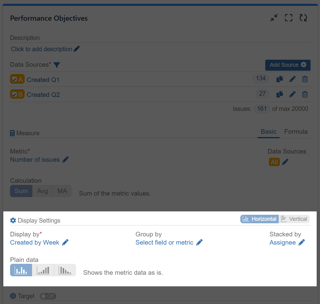 There are three data view options available: display by, group by, and stack by. With these options, you can select how the issues are displayed and organized based on existing fields and metrics or data from multiple data sources.