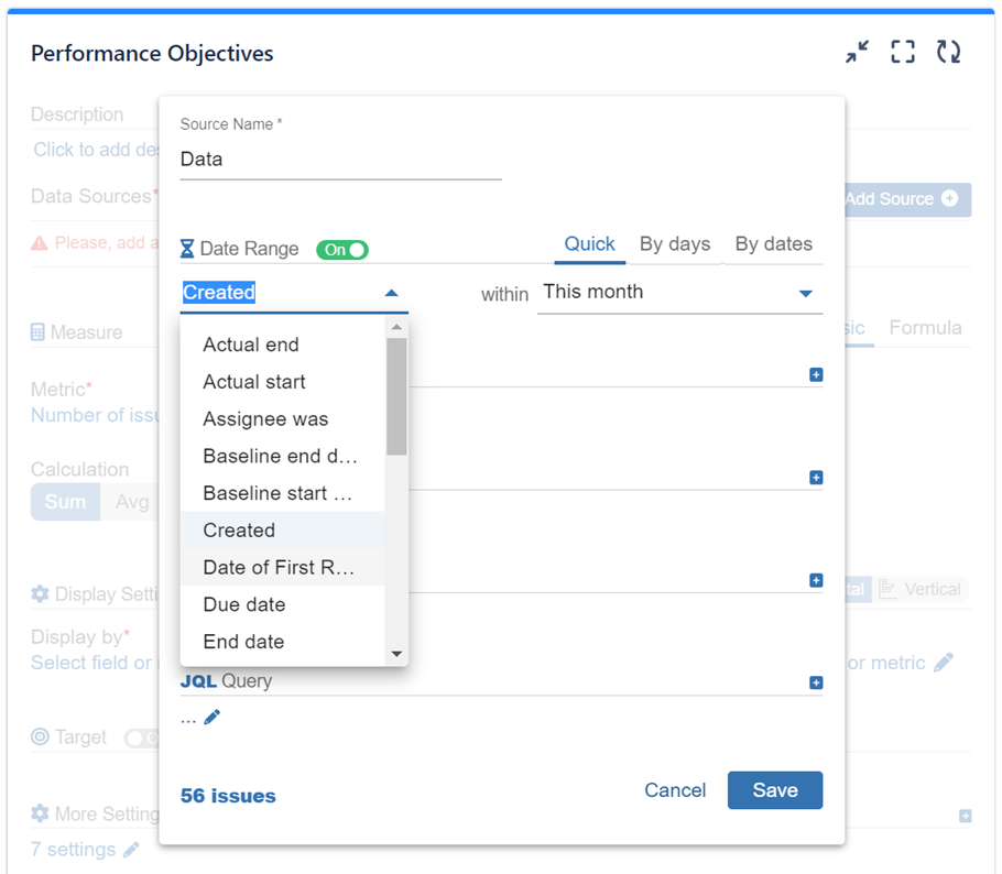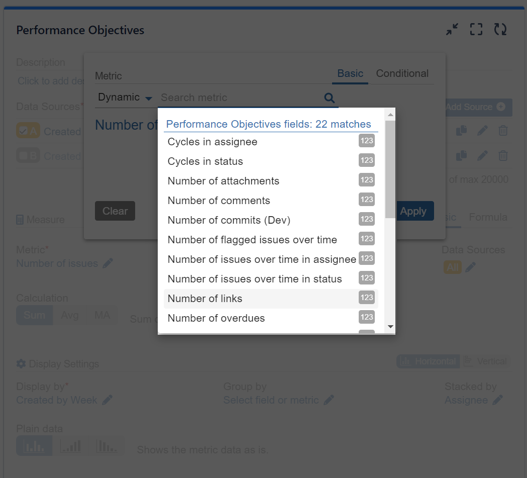 The Performance Objectives dashboard gadget offers a wide range of Standard Jira and Dynamic metrics to suit your specific needs. You have the flexibility to choose from various options such as ‘Time/Cycles in Status’ or ‘Number of Issues Over Time in Assignee’, ‘Number of Flagged Issues’, Comments, Votes, and ‘Work Logged Time (h)’.