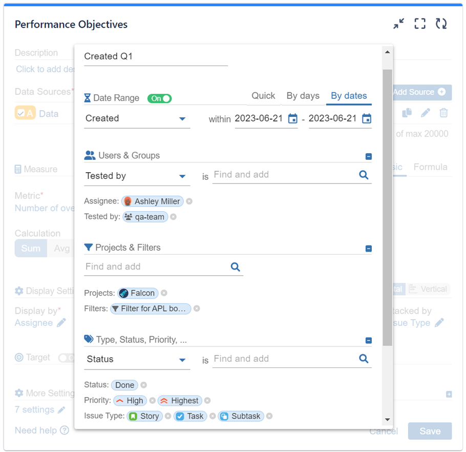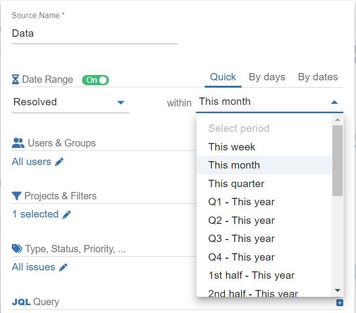 JQL data segmentation, segmentation by users, groups, project, issue type, priority, label, resolution. You can also use your saved project filters as Data Source.