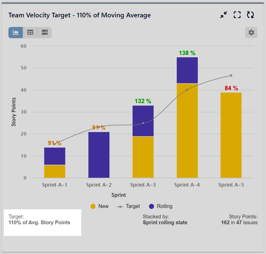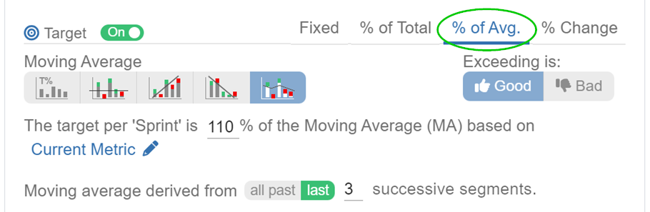 This target type empowers you to establish a goal as a percentage of average current metric, % of average any other relevant metric, or define a dynamic moving average target. Furthermore, you have the flexibility to customize the moving average period (the number of x-axis segments to calculate the moving average). In the illustrative example, the target is set at 110% of completed Story Points, referencing the moving average of completed Story Points from the previous three sprints.