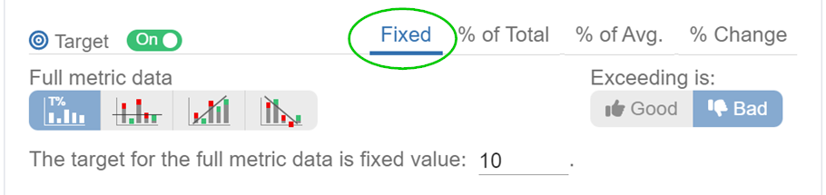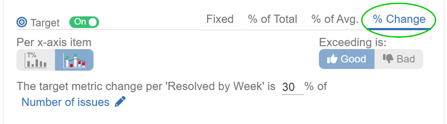 The ‘% Change’ target type exclusively supports two target display result options: “Full Metric Data” and “Per X-Axis Item.