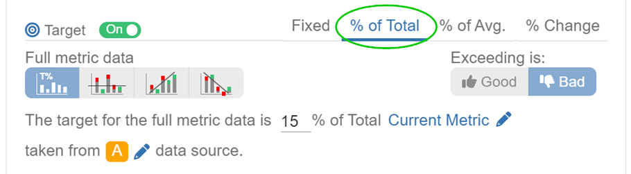 This target type empowers you to define a numeric percentage value of your choosing, based on the total of the current or any other metric. Additionally, you have the flexibility to select the data source from which this metric is extracted.