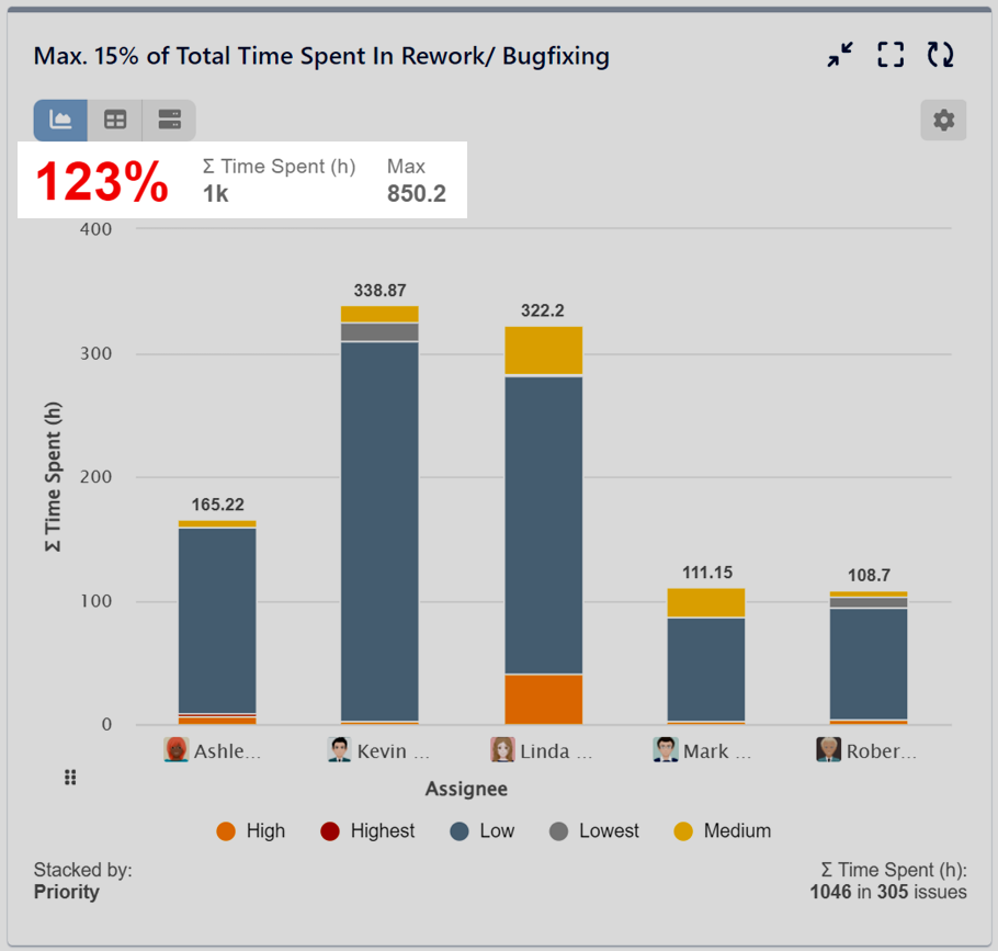 Performance Objectives: Charts for Jira provides a diverse range of target types, offering you unparalleled flexibility in tracking your company’s goals. These targets can take on various forms, such as ‘Fixed Value,’ ‘% of Total,’ ‘% of Average,’ and ‘% Change.’ What’s more, you have the freedom to source data for these targets from any Data Source or metric you choose. This level of customization enables you to set targets based on historical performance, or even by comparing them to other metrics. For example, you can establish targets by referencing the ‘Original Estimate’ metric against metrics like ‘Time Spent’ or ‘Work Log Time.’ With such versatility at your fingertips, you can align your objectives precisely to your unique business needs.